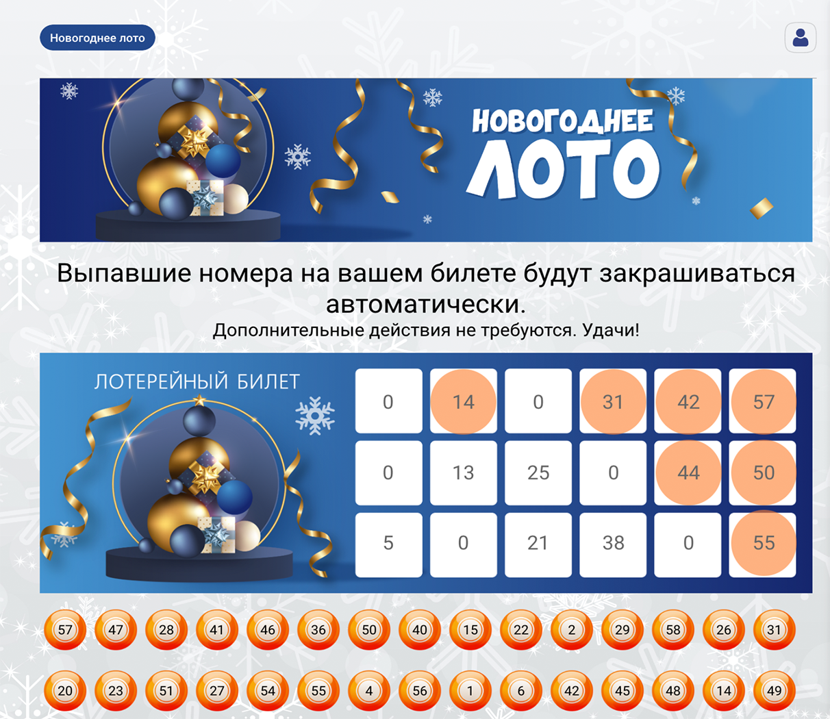 Забудьте про оливье и грустные огоньки на ёлке! В нашем новогоднем приложении - настоящее цифровое веселье! Каждый гость получает билет (а то и два!), а ведущий тянет шары онлайн. Совпали циферки? Система сама всё отметит, никакого мошенничества, честное пионерское, как в тиражной комиссии! Готовьтесь кричать "Бинго!" и требовать свой заслуженный мешок подарков!