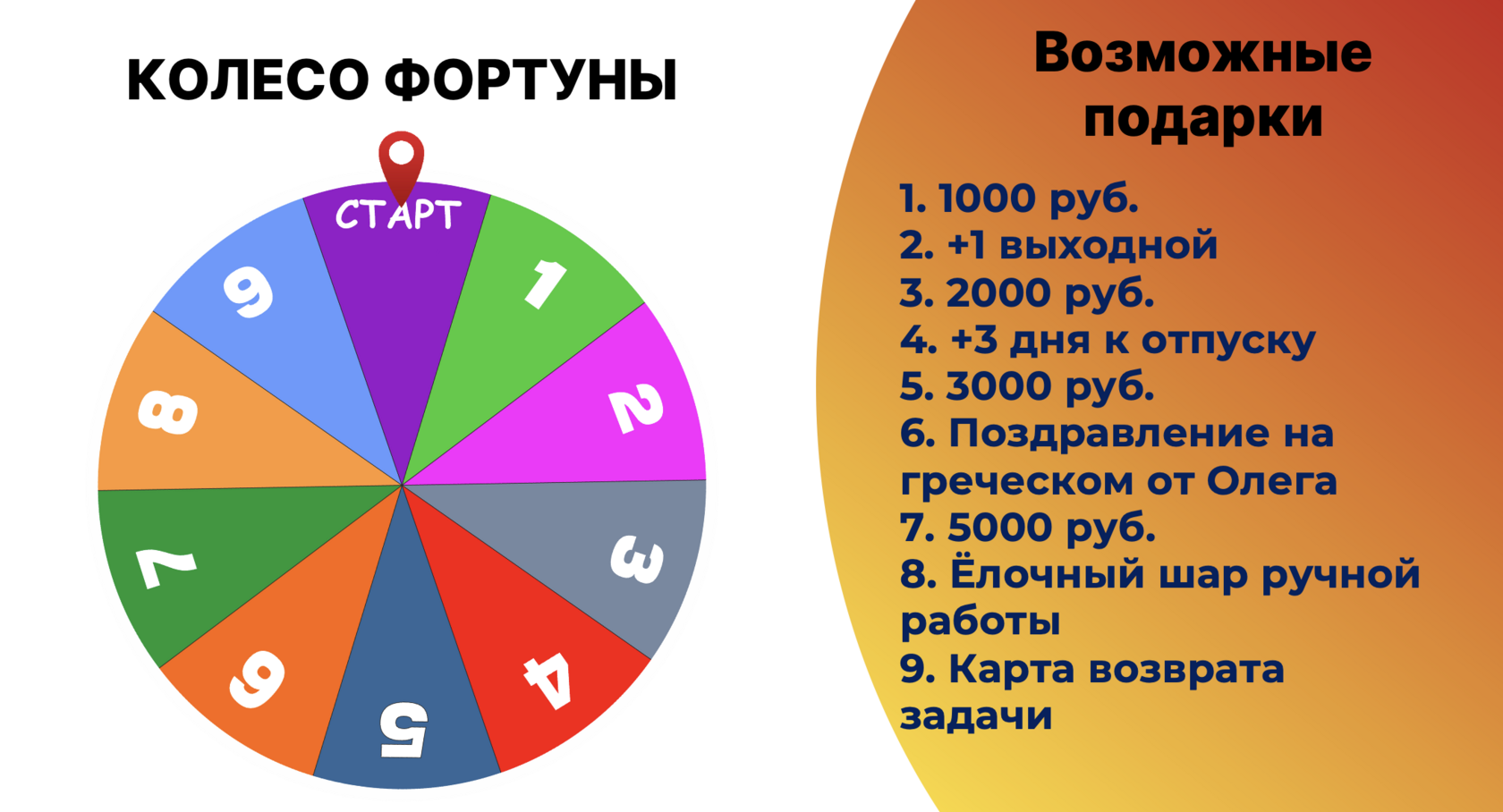 Колесо фортуны - хорошо как заключительный этап праздничной программы, это волшебный момент, когда удача улыбается каждому. Ведущий вращает колесо фортуны, а судьба решает, какие чудесные подарки достанутся победителям и участникам активностей!