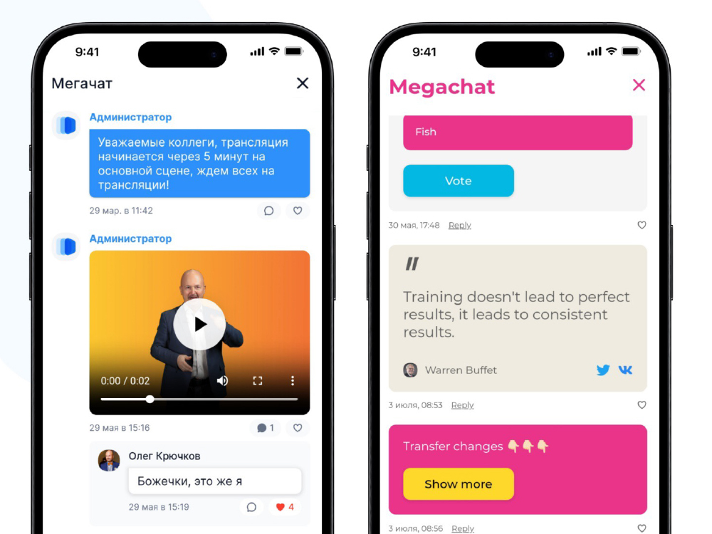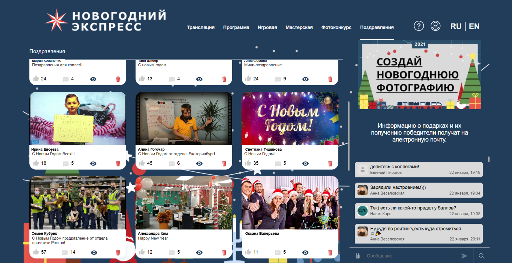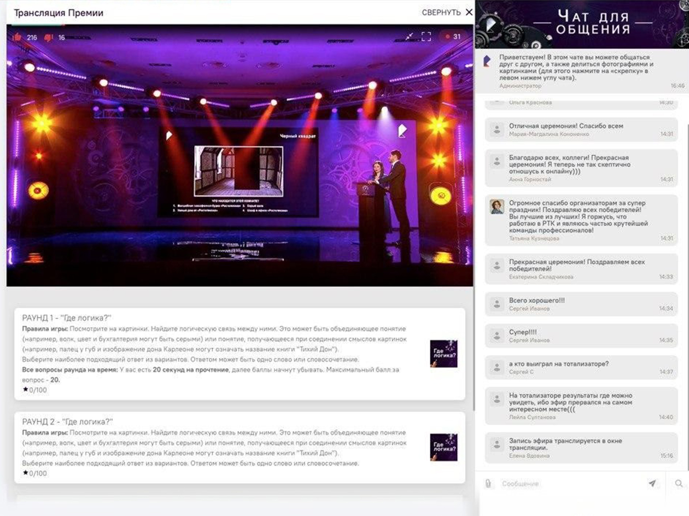 Мы интегрируем плеер, который выберете вы (facecast, vk видео, CDNvideo, Edge Center), чтобы ваши коллеги, даже если они далеко, почувствовали атмосферу праздника!