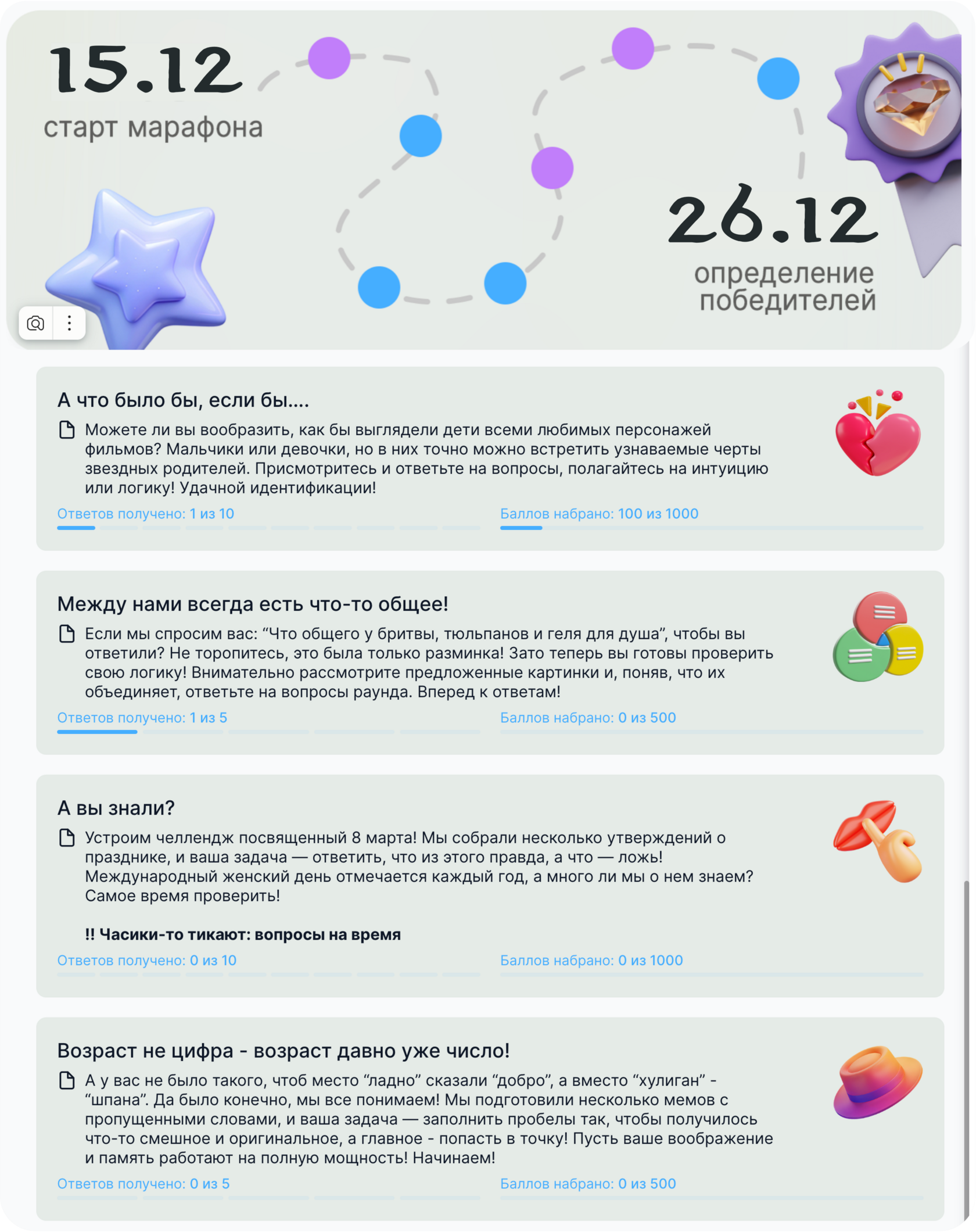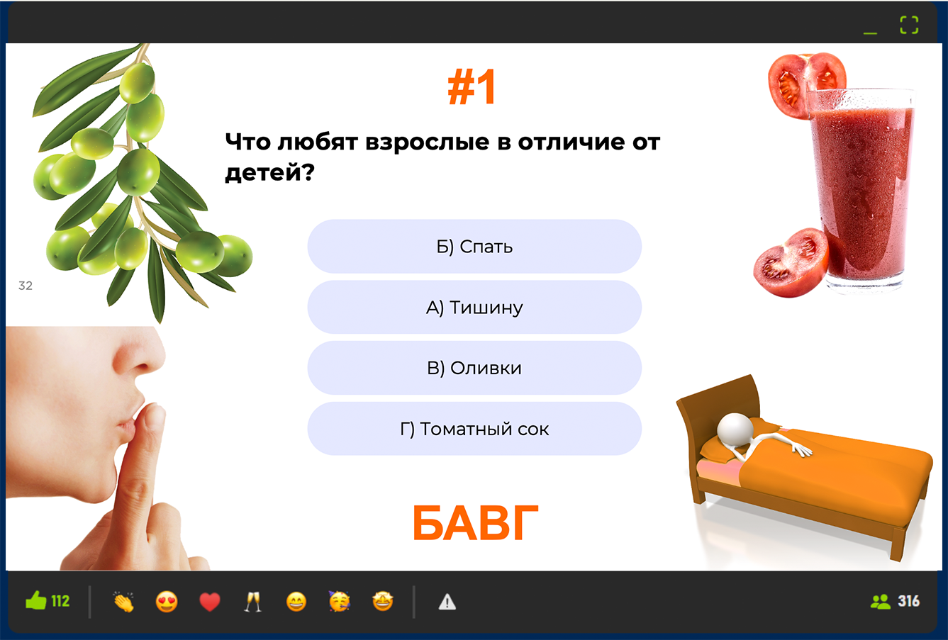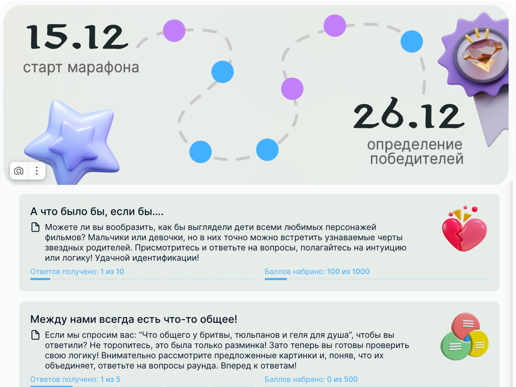 Прокачайте свой мозг, блесните эрудицией, проявите смекалку и весело проведите время в компании коллег! "Фитнес для мозга" - это отличный способ подготовиться к праздникам, зарядиться позитивом и доказать, что вы - настоящие интеллектуальные гении: отвечайте на вопросы, разгадывайте ребусы, расшифровывайте мелодии и проявляйте свои творческие способности!