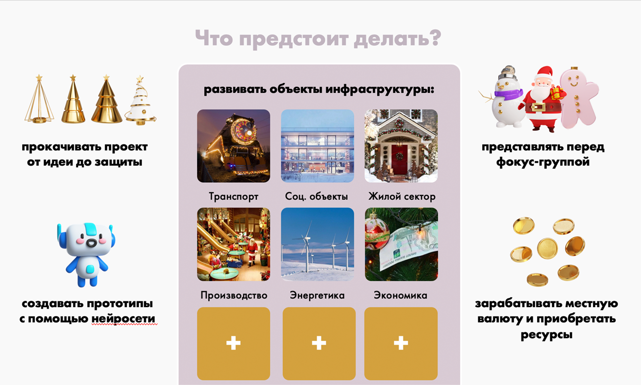 Резиденция Деда Мороза расширяется, и вам доверено построить целый Новогодний город-фабрику. Дайте волю фантазии, ведь вам предстоит спроектировать и построить город мечты для новогоднего волшебства! Вас назначают градостроителями Новогодней Фабрики, где будут создаваться подарки, собираться желания и твориться настоящее чудо. Постройте город, который вдохновит Деда Мороза и порадует всех жителей!